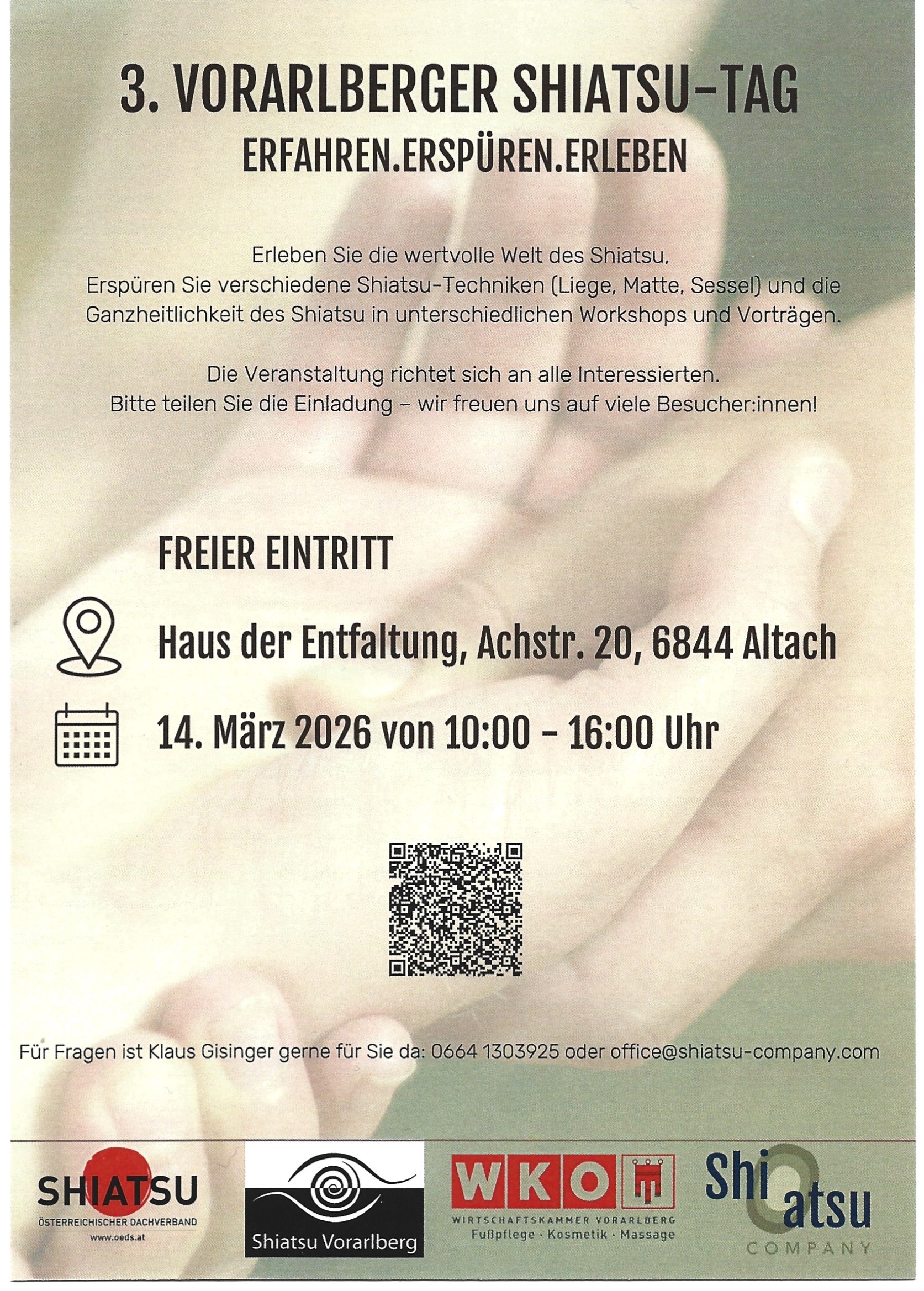 Unser Shiatsu Tag findet heuer bereits zum 3. Mal statt - wir freuen uns wieder auf zahlreiche Besucher! Reserviert gleich den Samstag, 14. März 2026 im Haus der Entfaltung in Altach