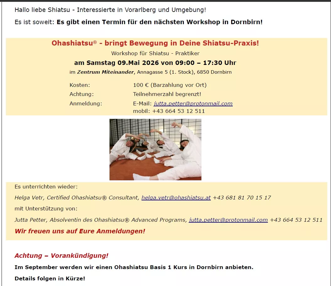Helga Vetr, Certified Ohashiatsu® Consultant, helga.vetr@ohashiatsu.at oder T 0681 81701517